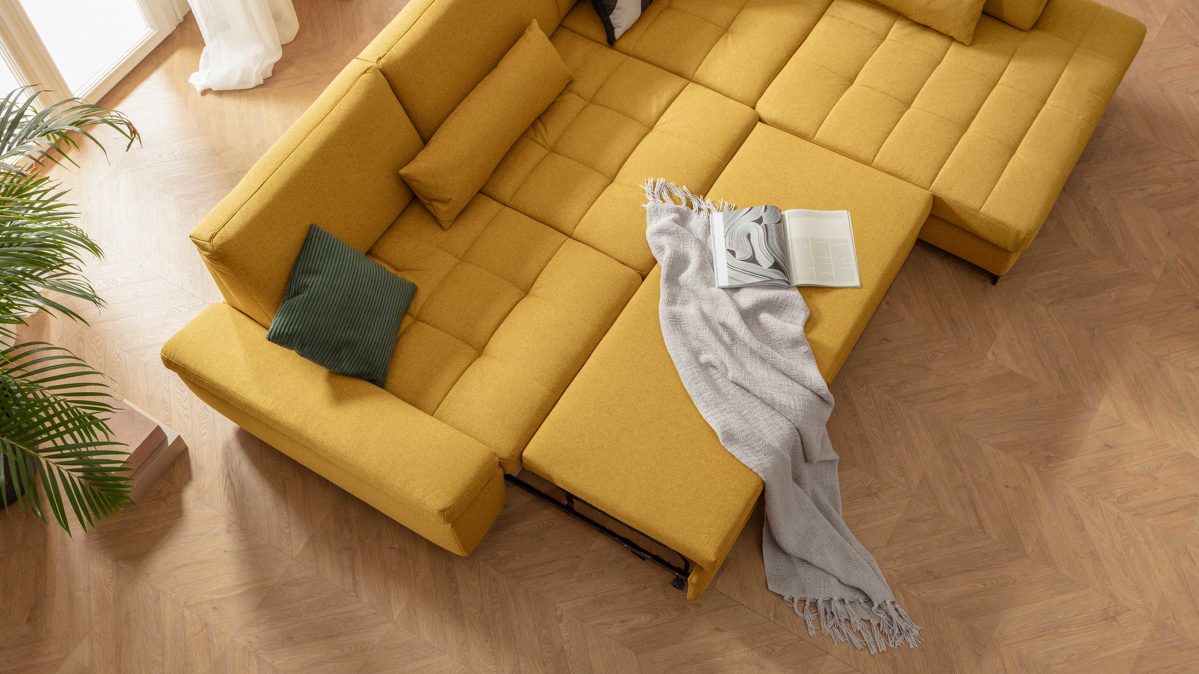 die Liegefläche wird ohne Aufpreis im gleichen Stoff wie das Sofa bezogen