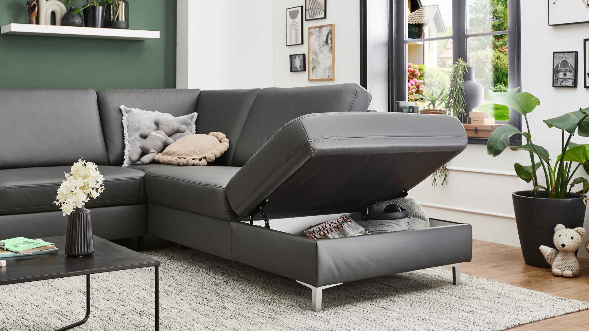 Das Sofaelement lässt sich mittels Rasterbeschlag bequem öffnen und schließen. Den innen weiß beschichteten und mit eingelassenen Lüftungsschlitzen versehenen Stauraum können Sie etwa zum Verstauen von Wohntextilien und Spielzeug nutzen.