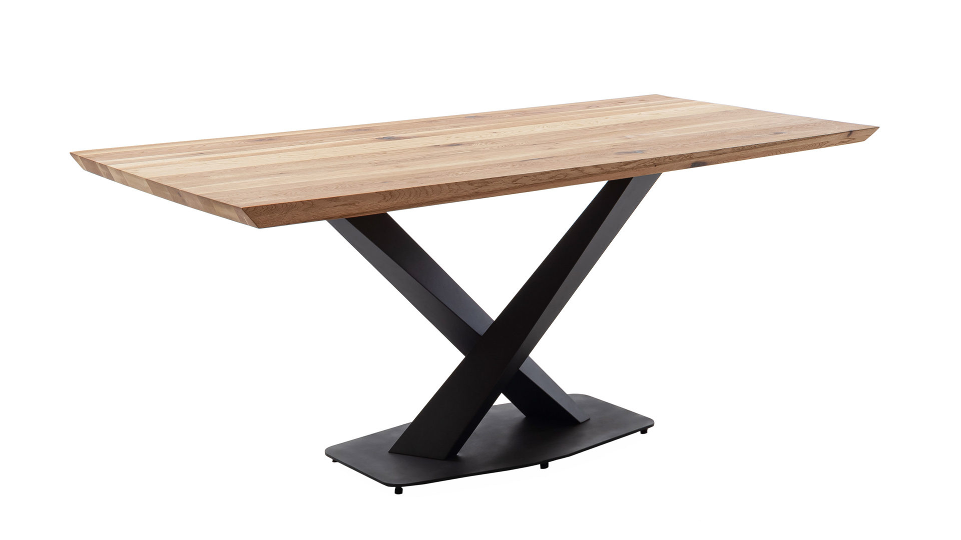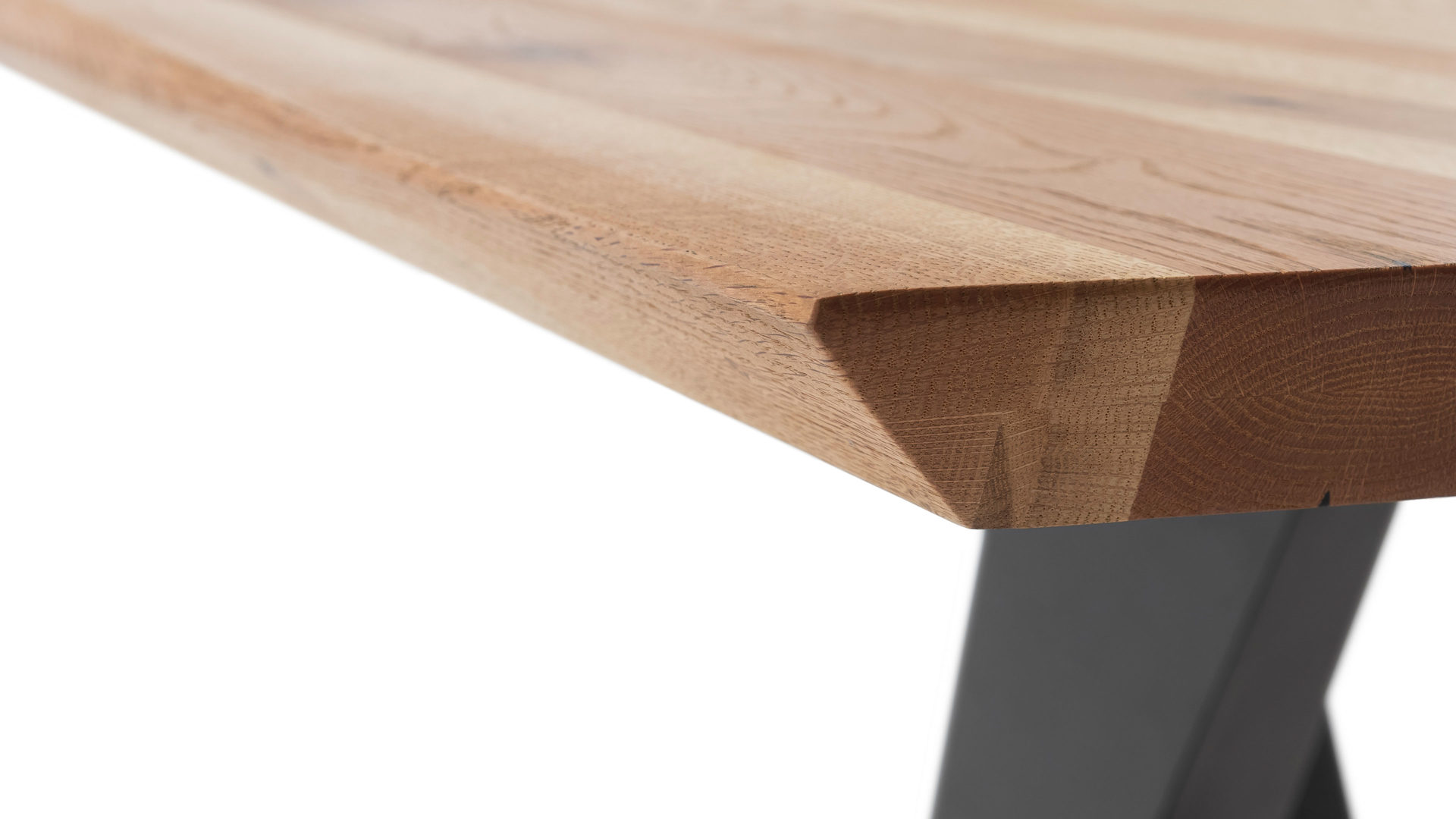 Tischplatte ca. 4 cm stark, aufgedoppelt, durchgehende Lamelle mit reverser Baumkante