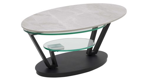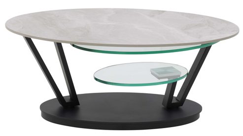 Der Sofatisch aus der Interliving Couchtisch Serie 6230 verbindet modernes Design mit innovativer Funktionalität. Die travertinfarbene Keramikplatte in Kombination mit edlen Klarglasplatten sorgt für eine elegante, zeitlose Optik. Das mattschwarz pulverbeschichtete Stahlgestell setzt dazu einen markanten Kontrast und verleiht dem Wohnzimmertisch eine stilvolle Leichtigkeit.