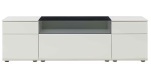 Die grifflosen Fronten mit Push-to-Open-Funktion unterstreichen das minimalistische Erscheinungsbild und lassen sich besonders komfortabel öffnen. Eine Klapptür sowie eine Schublade bieten dir praktischen Stauraum für Technik, Zubehör oder persönliche Dinge. So bleibt dein Wohnbereich klar strukturiert und ordentlich.
