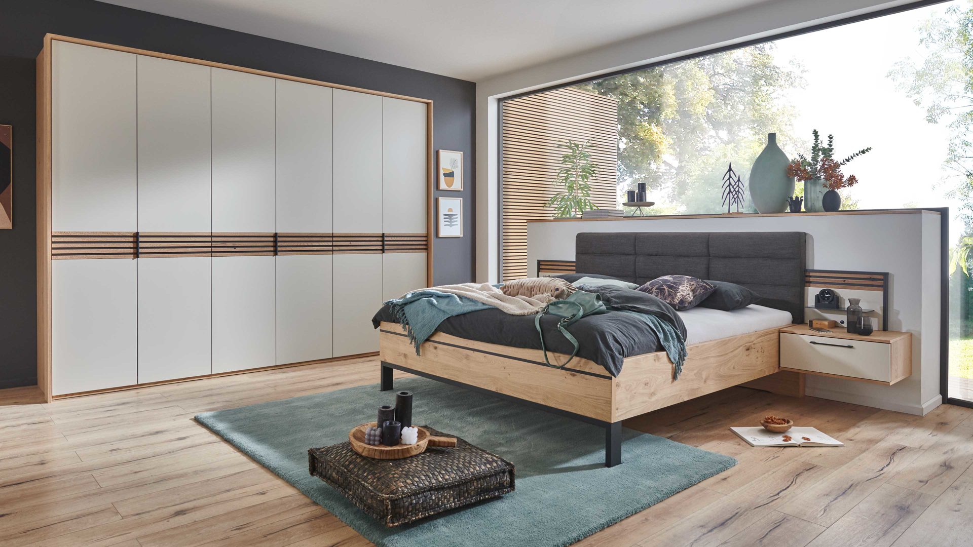 Die Kombination besteht aus einem 6-türigen Kleiderschrank, der durch eine Bauchbinde aus Riffholz und Leisten in Anthrazit besonders hervorsticht. Der Kleiderschrank bietet ausreichend Stauraum für Ihre Kleidung und Accessoires. Das Doppelbettgestell mit einer Liegefläche von ca. 180 x 200 cm verfügt über ein anthrazitfarbenes Polsterkopf- und Fußteil mit Winkelfuß und Leiste. Dies sorgt nicht nur für einen angenehmen Schlafkomfort, sondern auch für eine moderne Optik. Zusätzlich sind zwei Hängenachtkommoden im Lieferumfang enthalten.