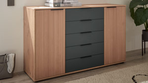 mattes Graphit, kombiniert mit biancofarbenen Eichenholzfronten mit Rillenstruktur, Korpus in biancofarbener Eiche Nachbildung und graphitfarbenen Metall-Griffleisten