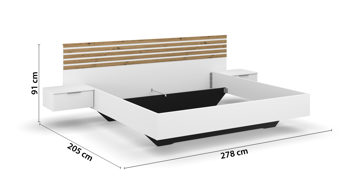 Das Doppelbettgestell ist nicht nur optisch ein Highlight, sondern bietet auch höchsten Komfort und Funktionalität. Mit einer Liegefläche von ca. 180 x 200 cm und Gesamtmaßen von ca. 278 x 91 x 205 cm (BxHxL) bietet es ausreichend Platz für zwei Personen. Zwei Hängenachttische sind inklusive und bieten praktische Ablagemöglichkeiten für Ihre persönlichen Gegenstände.
