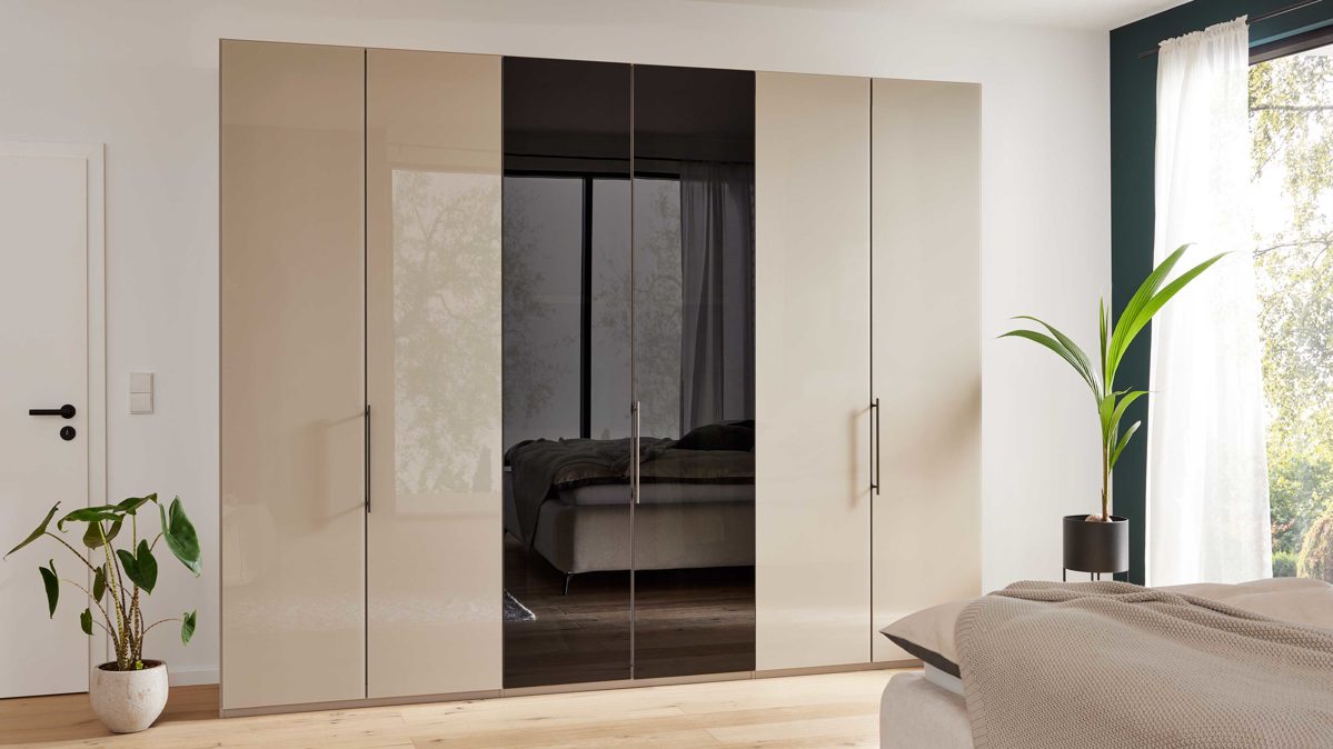 Gestalte frei nach deinem Stil: Ob Drehtüren, Schwebetüren, Falttüren oder Ecklösungen – du kombinierst ganz nach deinem Bedarf. Maßgeschneidert für dein Zuhause: Wähle zwischen zwei Höhen (ca. 216 cm oder ca. 236 cm) und vielen Breiten von ca. 37,5 cm bis 400 cm – perfekt für kleine Schlafzimmer oder großzügige Ankleidezimmer. Stilvolle Vielfalt: Entscheide dich für Glasfronten in Weiß, Champagner oder Kieselgrau, optional mit Kristallspiegeln. Für den Korpus stehen Bianco Eiche Nachbildung, Graphit, Champagner oder Kieselgrau zur Auswahl. Cleveres Zubehör: Mit Innenschubladen, Passepartoutrahmen oder modernen Beleuchtungssystemen machst du deinen Schrank so individuell wie dein Alltag.
