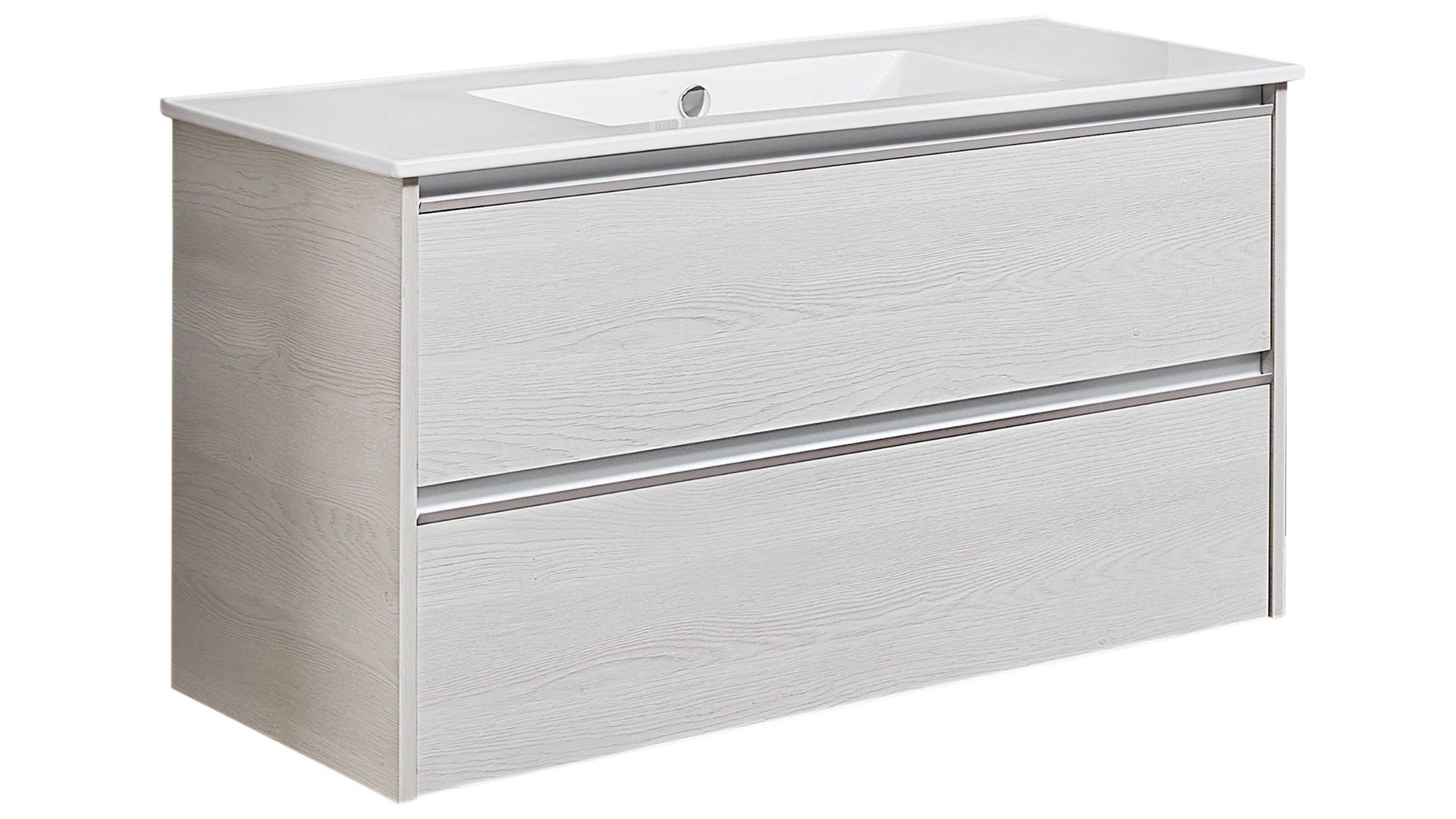 Der pelipal Waschtischunterschrank Serie 6040 begeistert mit puristischen Designmerkmalen und hoher funktionaler Stärke. Charakteristisch sind die Fronten und der Korpus in weißer Eiche-Nachbildung. Sie verleihen dem Badmöbel eine zeitlos elegante Ausstrahlung. Für eine stilsichere Abrundung sorgen die matten alufarbenen Griffleisten.