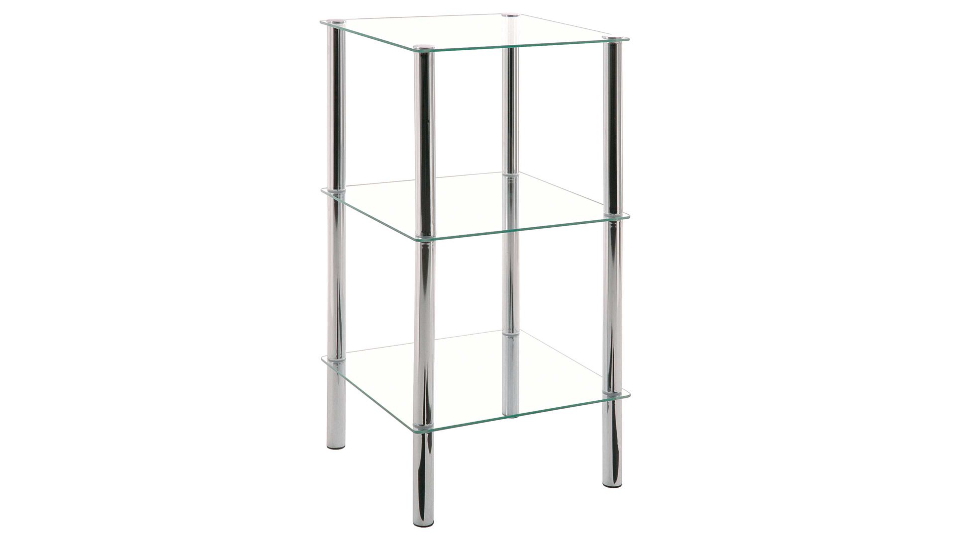 Das stilvolle Glasboden-Regal erweist sich als idealer Partner, wenn es darum geht, Ihre Wohnzimmereinrichtung aufzuwerten. Die verchromten Stahlfüße des Kleinmöbels verbinden sich mit drei Klarglasplatten zu einem stimmigen Designkonzept. Mit Maßen von ca. 39 x 77 x 39 cm (BxHxT) ist das Regal nicht nur schön kompakt, sondern auch überraschend geräumig. Drei Böden halten ausreichend Platz für Zeitschriften, einen Blumentopf, Teelichter sowie weitere Dekoaccessoires bereit.