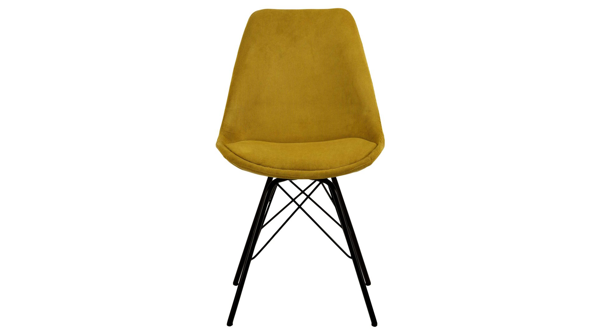 Dieser Polsterstuhl verkörpert klassische Eleganz. Als stabile, dabei aber wunderbar filigran designte Basis fungiert ein mattschwarz pulverbeschichtetes Stahldrahtgestell. Darauf befindet sich eine gelbe Sitzschale aus robustem Kunststoff. Sie ist rundherum mit Feincord bezogen, ebenfalls in warmem Gelb. Der angesagte Feincordbezug überzeugt sowohl qualitativ als auch optisch und haptisch.