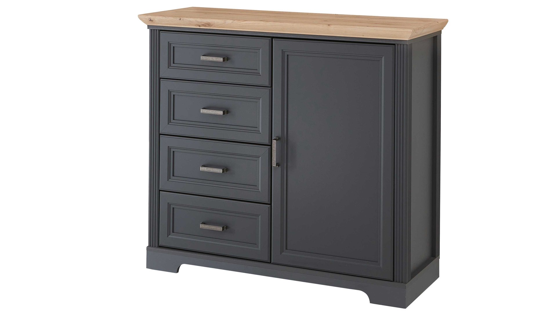 Die Kombikommode ist im angesagten Landhausstil designt. Front und Korpus sind in edlem Graphit gehalten, während sich der Oberboden in Artisan-Eiche-Nachbildung präsentiert. Durch die gelungene Farbkombination strahlt die Kommode hochwertige Eleganz aus. Für das gewisse Etwas sorgen die antikfarbenen Metall-Muschelgriffe. Wiederum graphitfarbene Füße runden den Look harmonisch ab.