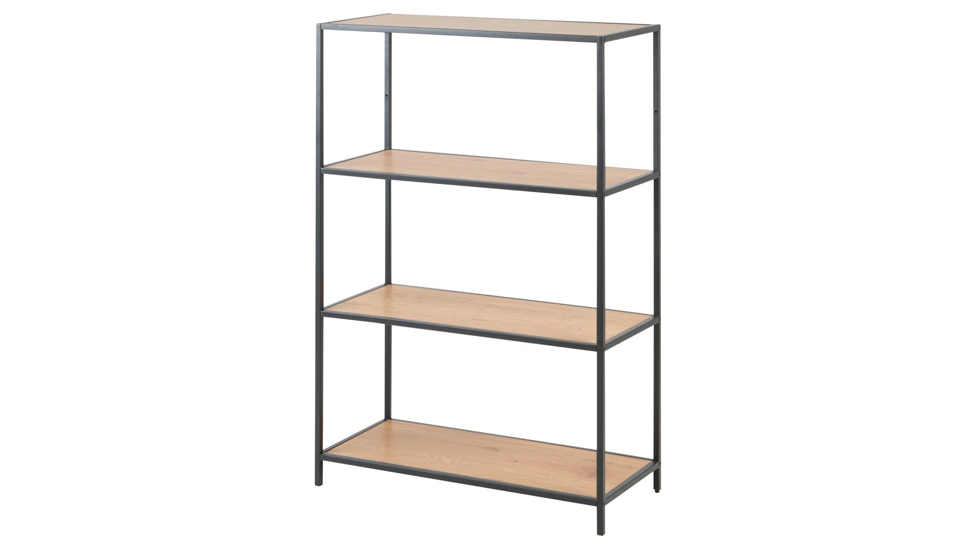 Mit Maßen von ca. 77 x 114 x 35 cm (BxHxT) bietet Ihnen das Regal mit drei Fächern genug Stauraum für alles Wichtige. Das schwarz pulverbeschichtete Stahlgestell mit rauer Oberfläche verpasst dem Bücherregal ein rustikales Finish und macht es zum absoluten Blickfang in Ihren vier Wänden.