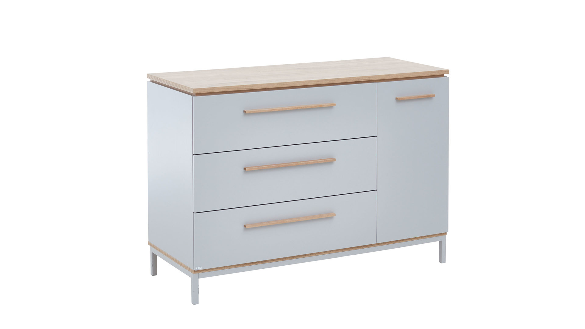 Die Kombikommode ist im angesagten Landhausstil designt. Front und Korpus sind in heller Pinien-Nachbildung gehalten, während sich der Oberboden in Artisan-Eiche-Nachbildung präsentiert. Durch die gelungene Farbkombination strahlt die Kommode natürliche Eleganz aus. Für das gewisse Etwas sorgen die antikfarbenen Metall-Muschelgriffe. Wiederum pinienfarbene Füße runden den Look harmonisch ab.