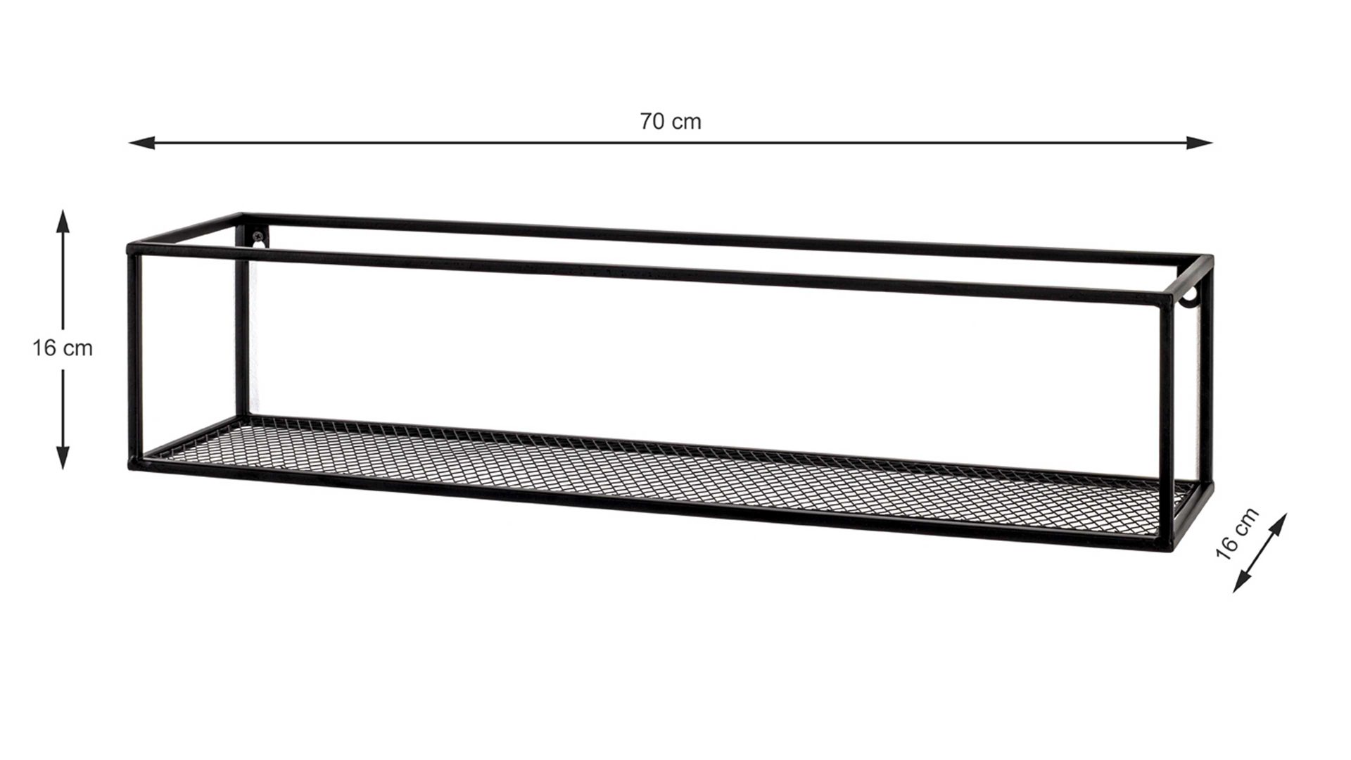 Dieses hochwertige Wandregal repräsentiert die Eleganz schlichter Modernität. Aus einem klassisch mattschwarz lackierten Metallgeflecht und Vierkantrohr-Metallrahmen gefertigt, erscheint es puristisch und ist dazu enorm robust und langlebig. Seine Maße betragen ca. 70 x 16 x 16 cm (LxHxT).