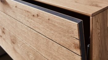 soft gebürstete Wildeiche, kombiniert mit stark gebürsteter Balkeneiche und einer carbonfarben pulverbeschichteten Metallplatte