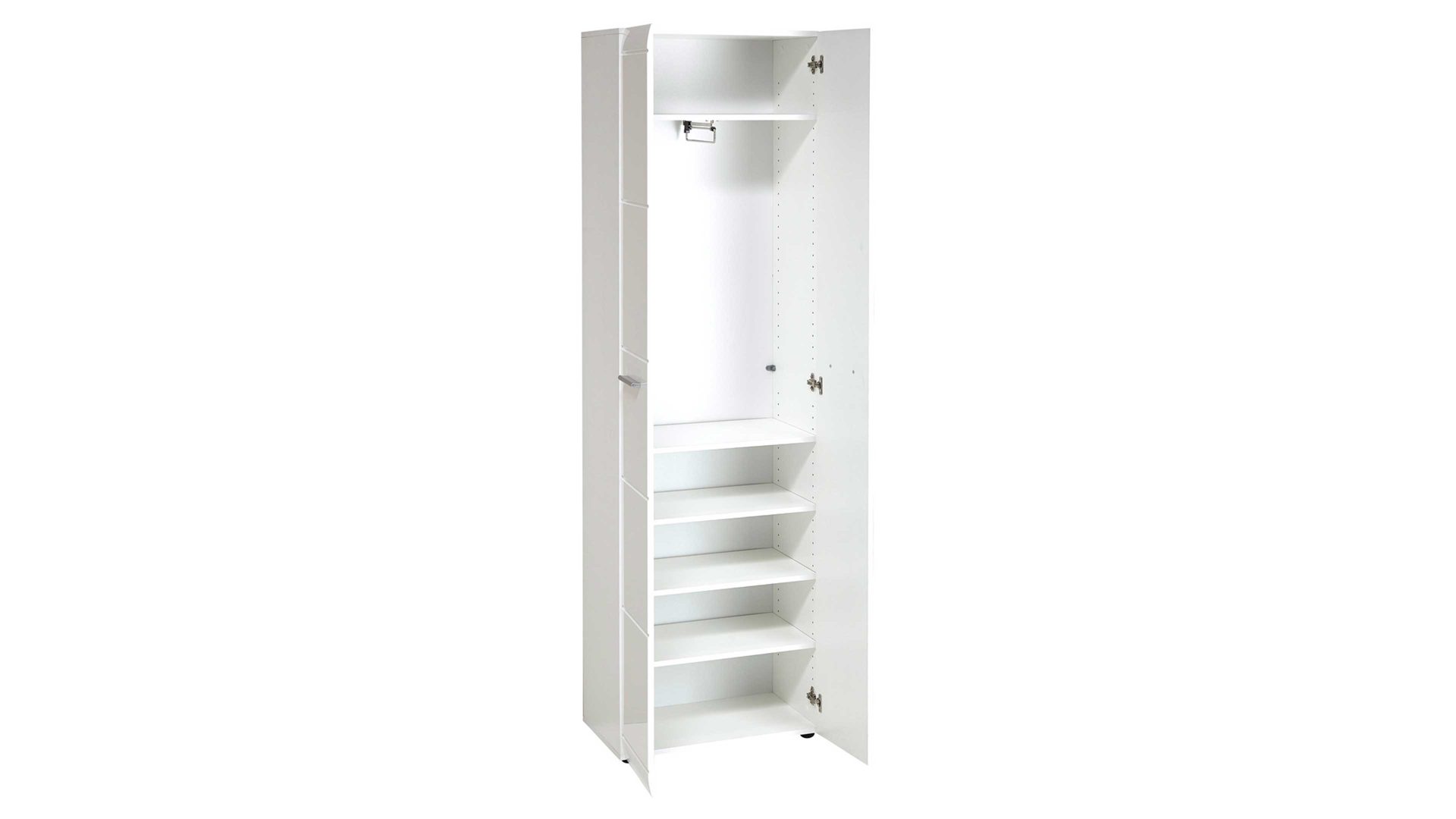 Der geräumige Garderobenschrank aus der Serie Adana ist nicht nur ein optisch überzeugendes Dielenmöbel, sondern überzeugt auch mit seinen inneren Werten. Fünf Böden und eine ausziehbare Kleiderstange bieten reichlich Platz für ihre Garderobe. Die weißen, MDF-tiefgezogenen Hochglanzfronten und die schicken Steggriffe vollenden das edle Design.