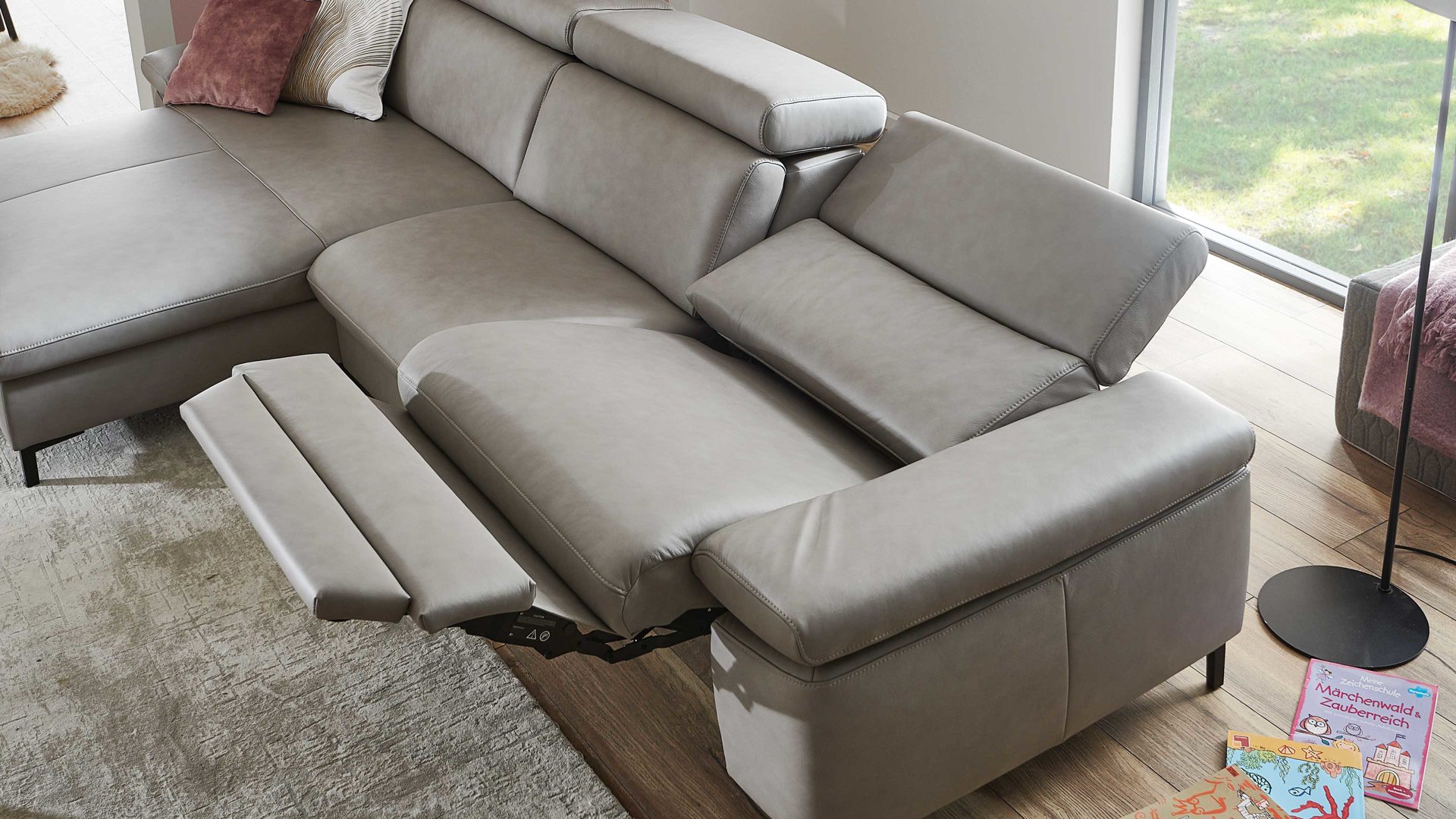 So funktioniert die WallAway-Funktion einschließlich Herz-Waage: Im ersten Schritt fährt die Beinauflage auf Sitzhöhe. Dabei geht der Sitz zusätzlich einige Zentimeter nach oben sowie nach vorn. In dieser Position bleibt der Rücken wandfrei.