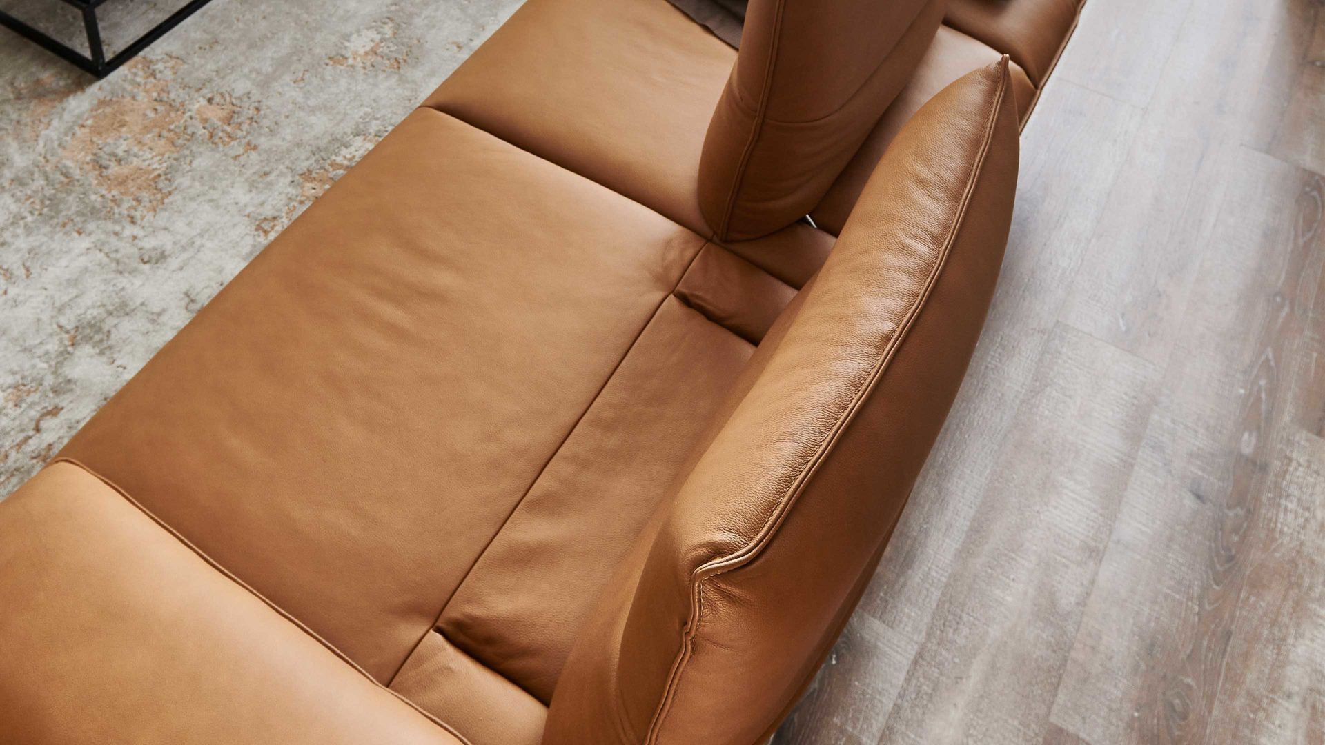 Die legere lockere Polsterung sorgt für höchsten Sitzkomfort und lädt zum Entspannen ein. Das echtlederbezogene Rückenteil gibt dem Sofa eine edle Optik und macht es zu einem echten Blickfang.