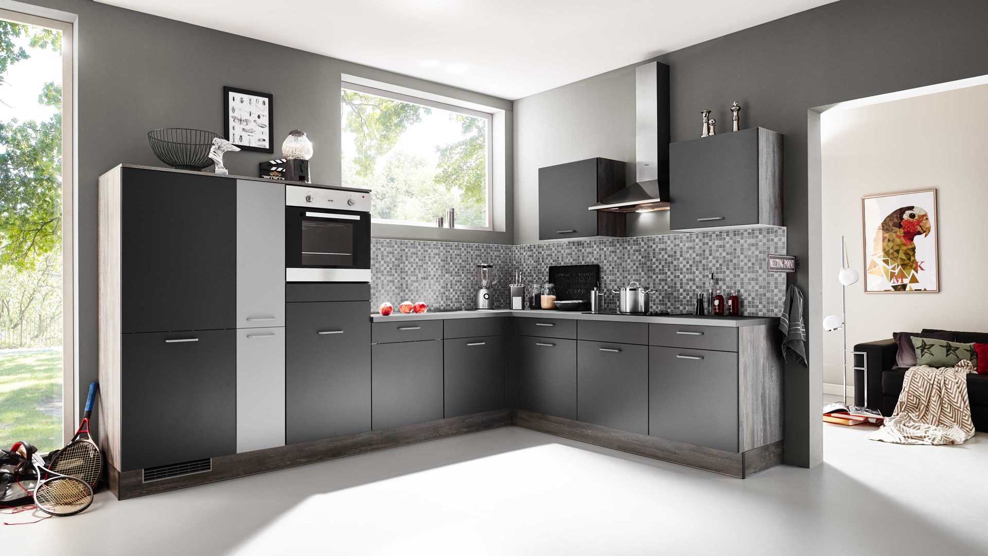 • Die Abbildung zeigt ein Wohnbeispiel, welches auch Dekoration sowie separat erhältliches Zubehör enthält. Im Lieferumfang enthalten sind eine Kücheninsel und eine Hochschranklösung.