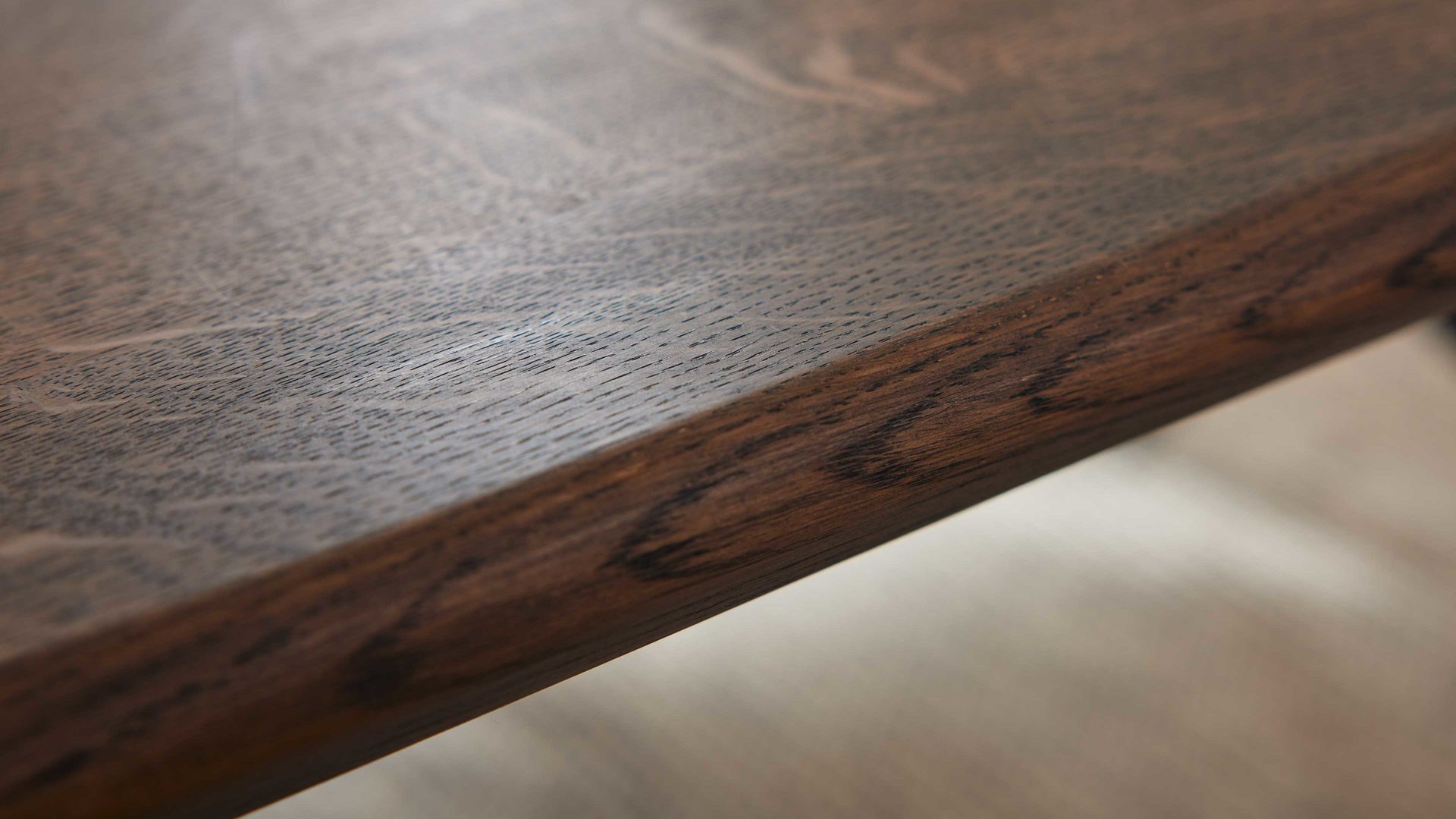 Besonderer Hingucker ist das robuste Gestell aus kreativ geformtem, schwarzem Stahl, das dem Tisch eine architektonisch anmutende Basis verleiht. Die Kombination aus dunkler Eiche und kühlem Metall sorgt für spannende Kontraste und verleiht deinem Wohnbereich einen urbanen Charakter.