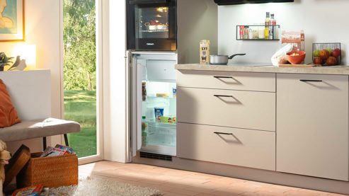 hochgebauter Backofen, vollintegrierter Kühlschrank und eine kopffreie Dunsthaube