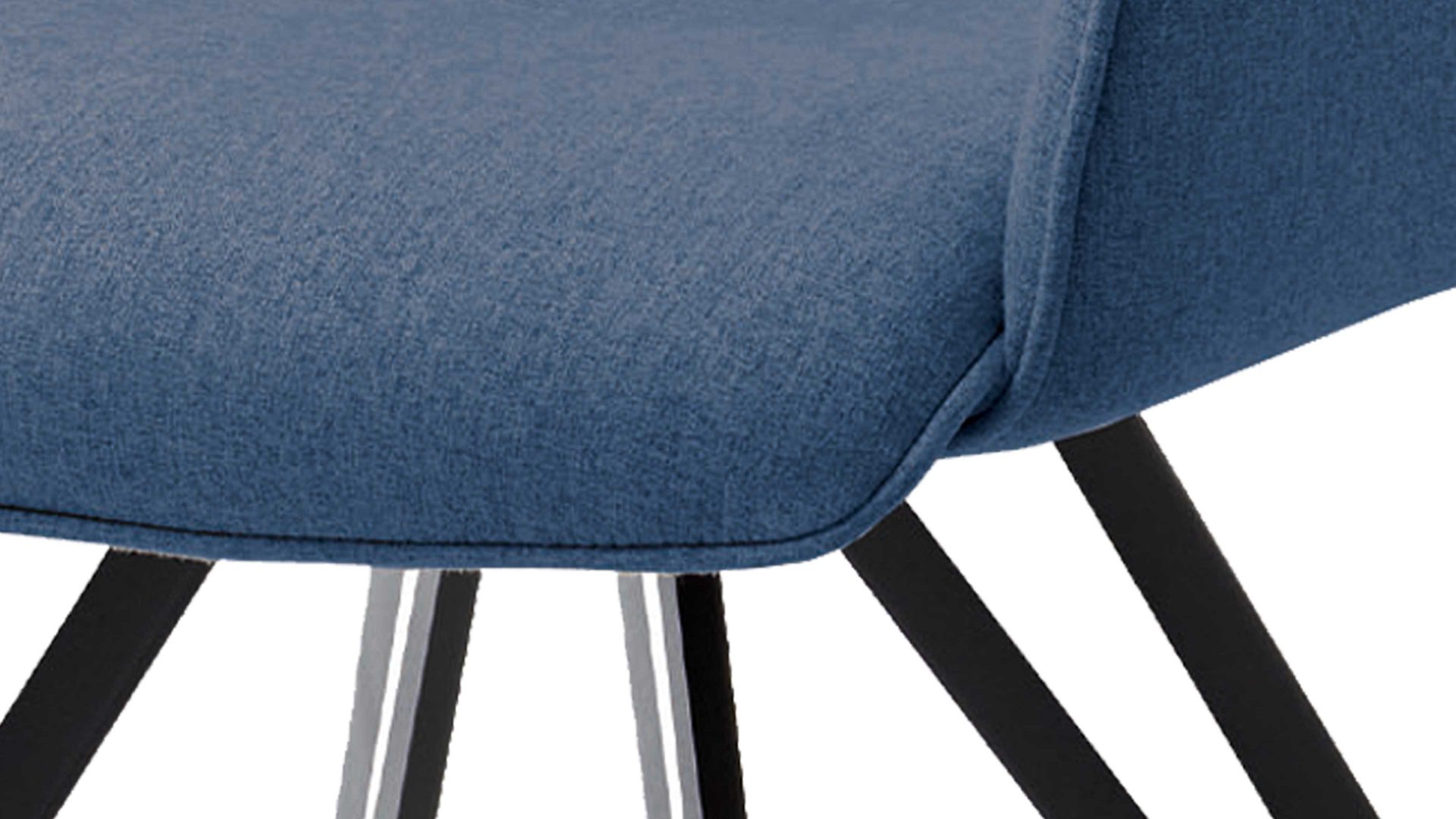 Der Armlehnstuhl Merlot präsentiert sich modern, kreativ und stilvoll designt. Er kombiniert einen blauen Webstoffbezug mit einem schwarz pulverbeschichteten Vierfuß-Flachstahlgestell. Letzteres sorgt für eine stabile Basis sowie für puristisch-elegantes Flair im Esszimmer. Dazu trägt auch der tiefe Farbton des hochwertigen, angenehm weichen Stoffbezugs bei. Überdies unterstreicht die spezielle Formensprache des Gestells die originelle Ausstrahlung des Vierfußstuhls.
