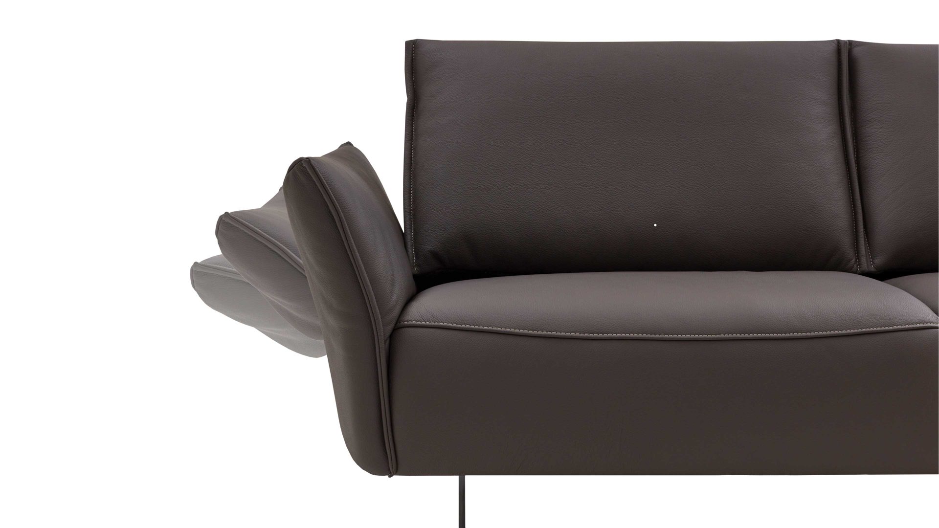 Das Funktionsarmteil der Couch ist durch einen Rasterbeschlag in verschiedenen Positionen verstellbar und bietet somit die Möglichkeit, die Armlehnen individuell an die Bedürfnisse anzupassen. Durch einfaches Ziehen über die höchste Position hinaus kann das Armteil wieder zurück in die Grundposition gebracht werden. Die Breite bei abgeklappter Armlehne vergrößert sich dann um bis zu 12 cm.