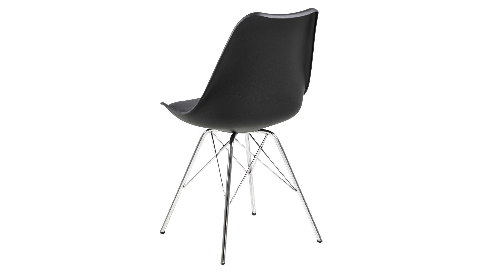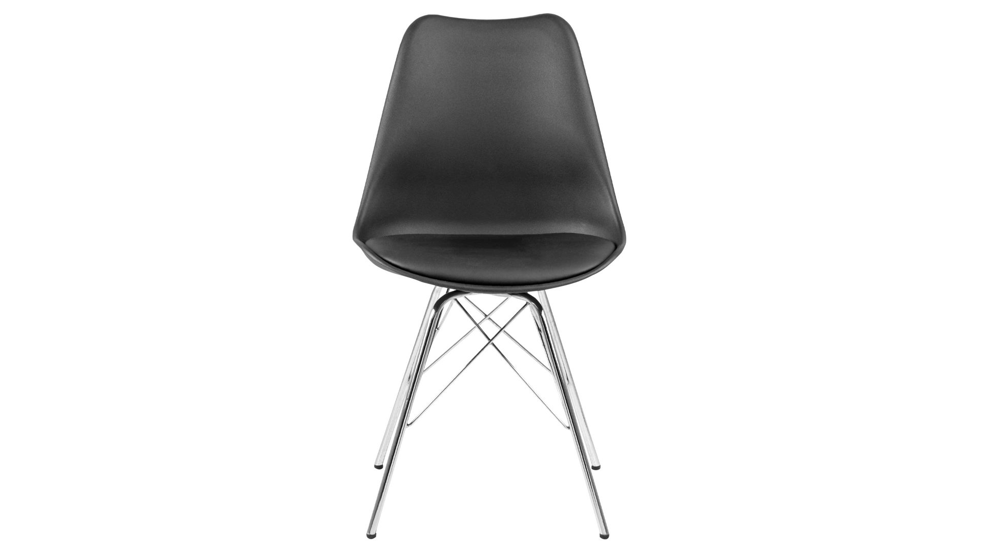 Dieser Polsterstuhl verkörpert puristische Eleganz. Als stabile, dabei aber wunderbar filigran designte Basis fungiert ein verchromtes Stahldrahtgestell. Darauf befindet sich eine schwarze Sitzschale aus robustem Kunststoff. Sie ist rundherum mit schwarzem Kunstleder bezogen, das sowohl qualitativ als auch optisch und haptisch überzeugt. Die Farbgebung sorgt für eine klassisch-schlichte Ausstrahlung.