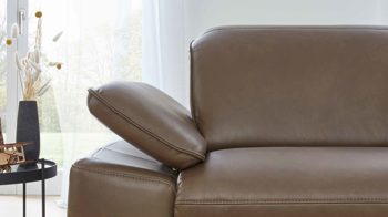 Für herausragenden Komfort sorgen neben der angenehmen Haptik des Leders die feste Federkernpolsterung auf einer stützenden Wellenunterfederung im Sitz und die mit softem Kaltschaum gepolsterten Rückenlehnen. Darüber hinaus sind die Kopfpolster manuell mittels Rasterbeschlag mehrfach verstellbar. Je nach Kopfpolstereinstellung variiert die Gesamthöhe des Sofas von ca. 85 bis 110 cm.