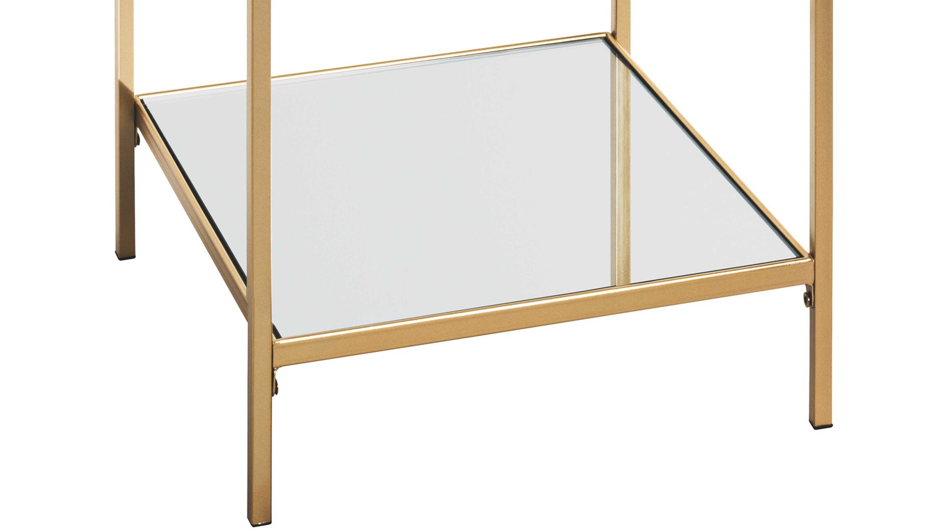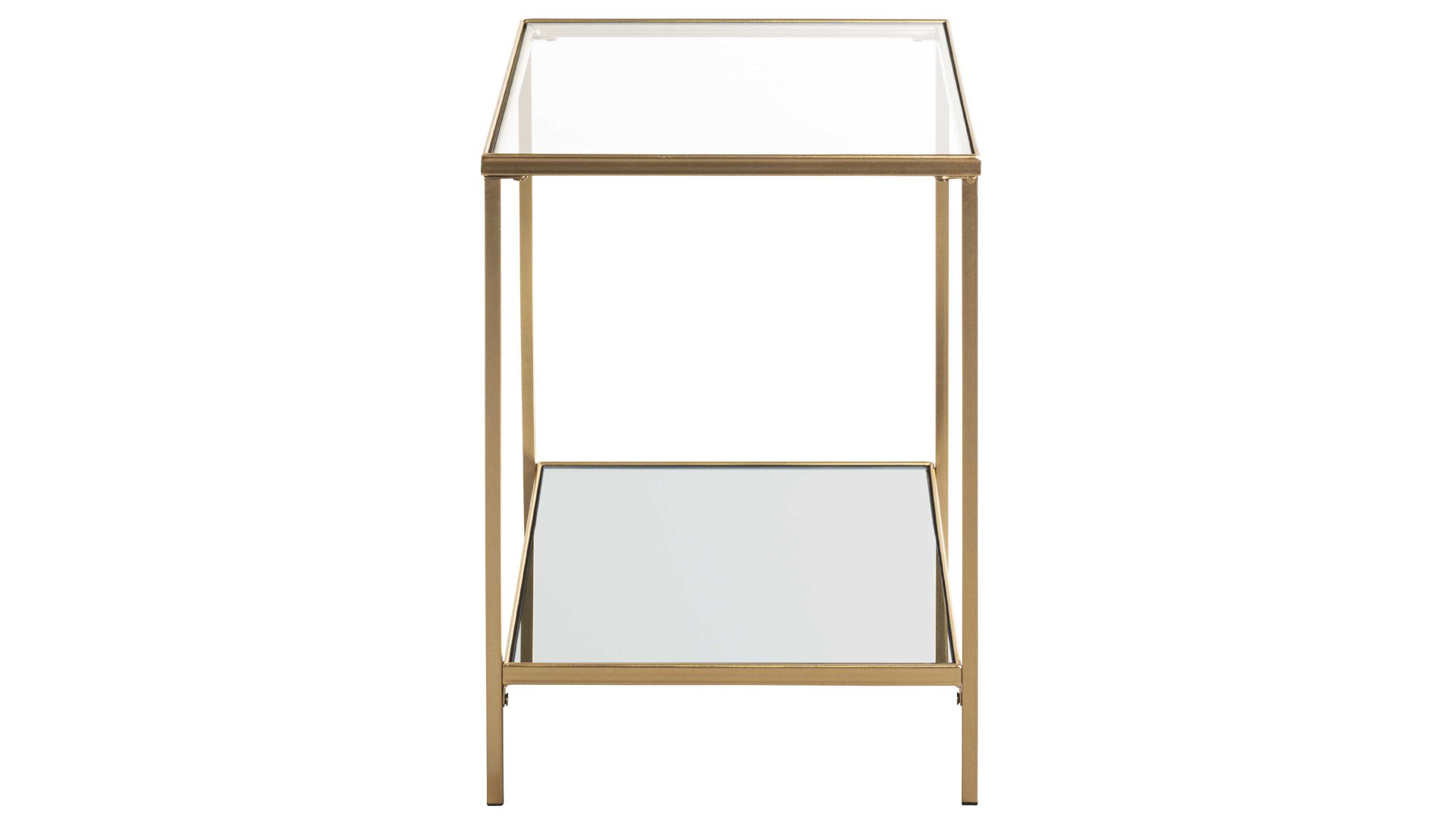 Der Beistelltisch Porto ist mit seinem modernen und eleganten Design ein absoluter Hingucker. Er kombiniert ein goldfarben lackiertes Metallgestell mit zwei Ablagen: Die obere besteht aus Sicherheitsglas und die untere aus Spiegelglas. Dank der hochwertigen Materialien ist das Tischchen robust, widerstandsfähig und langlebig. Seine Maße belaufen sich auf ca. 39 x 55 x 39 cm (BxHxT).