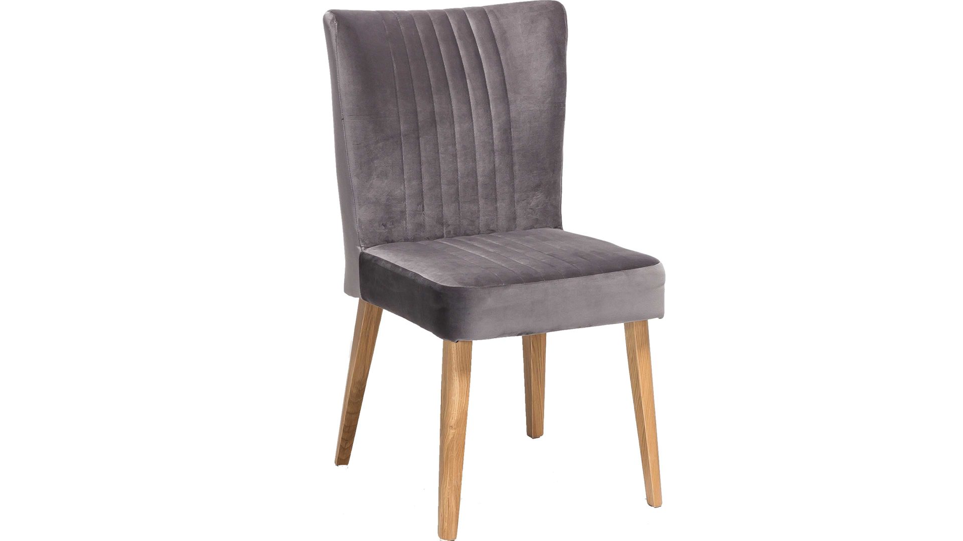 Dieser hochwertige Polsterstuhl mit grauem Bezug hat einen modernen Samtlook und ist damit ein klassisches Sitzmöbel. Eine zusätzlich interessante Optik verleihen dem Esszimmermöbel seine aufwendigen Steppnähte, die auf Sitz und Rücken angebracht sind. Zu mehreren passt der Polsterstuhl mit den Maßen von ca. 46 x 92 x 66 cm (BxHxT) optimal an einen Esstisch aus Eiche, denn das Holzgestell besteht ebenfalls aus Eiche natur.