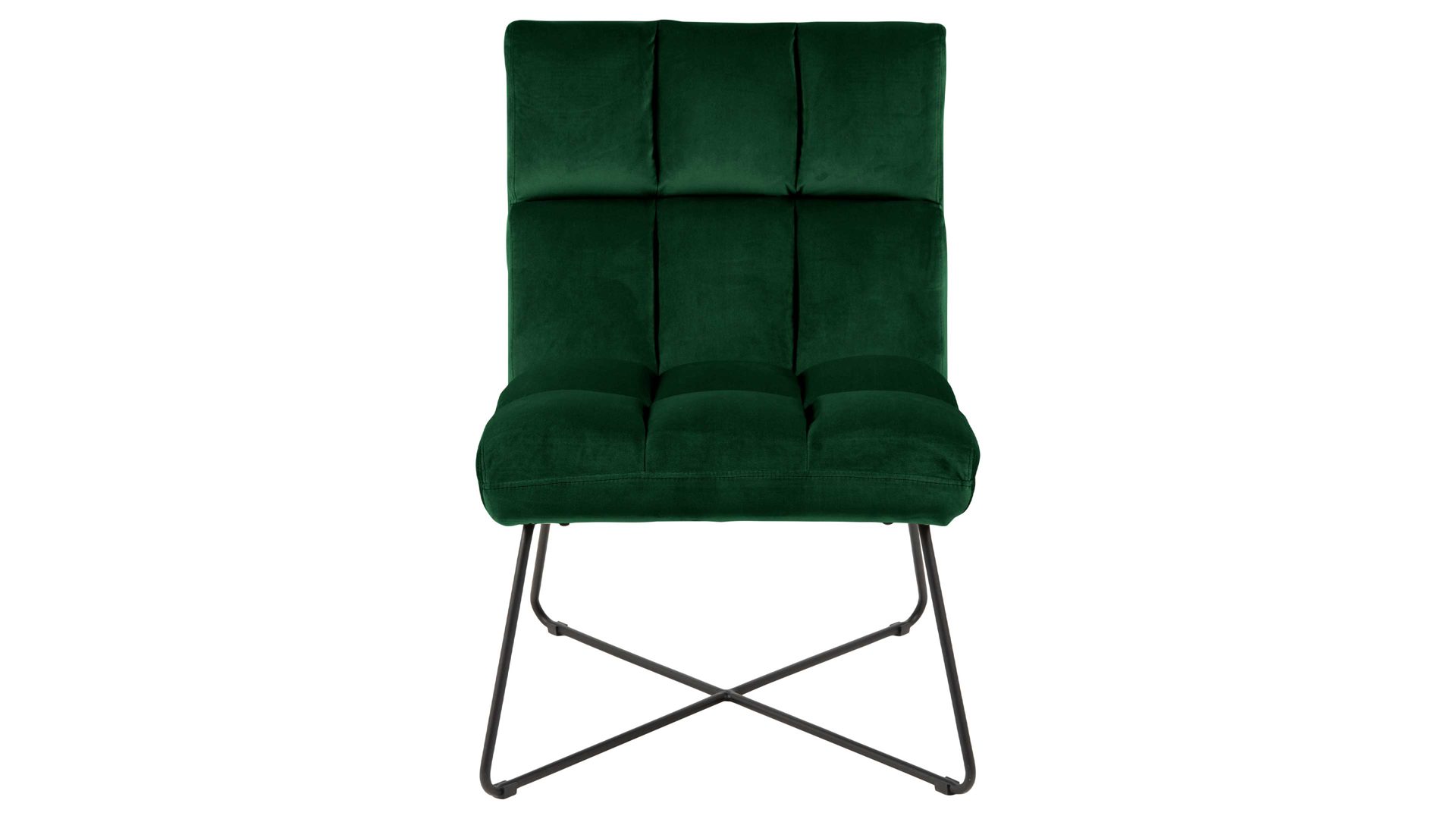 Dabei harmoniert der Polsterstuhl in seiner sanften Formensprache mit zahlreichen Einrichtungsstilen. Moderne Geradlinigkeit ergänzt er ebenso stimmig wie den beliebten Vintage-Trend. In jedem Fall belebt der Relaxstuhl das Interieur durch einen leuchtenden Farbakzent. Dafür sorgt der Samtbezug in Waldgrün. Seine gemütliche Steppung umhüllt sowohl die Sitzfläche als auch die Rückenlehne. Neben dem außergewöhnlichen Farbton erzeugen die gekreuzten filigranen Standfüße einen weiteren Blickfang. Das rau pulverbeschichtete und mattschwarze Metallgestell bildet zum tiefen Grün einen tollen Kontrast.