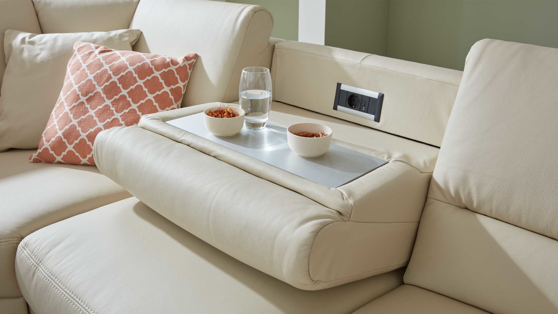 Indem Sie das Rückenpolster kurz mit einem Handgriff nach vorne klappen, offenbaren Sie eine praktische Ablagefläche, auf der Sie etwa bei einem Filmabend Gläser und Snacks platzieren können. Die Ablageplatte wird stets an den Farbton der Couchfüße angepasst. Als zusätzliches Highlight sind in den Rückenteil des Sofas Funktionsbuchsen - genauer gesagt eine Steckdose und ein USB-Anschluss - integriert. Somit können Sie hier auch bequem Ihr Mobiltelefon aufladen oder Ihr Notebook anschließen.