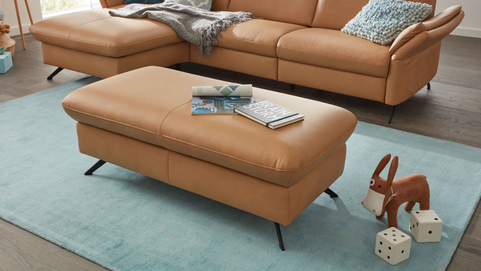 Der XXL-Hocker aus der Modulmaster-Polsterserie MM-PN1161 kombiniert honigfarben pigmentiertes Glattleder mit mattschwarzen Metallfüßen. Er strahlt moderne Eleganz aus.