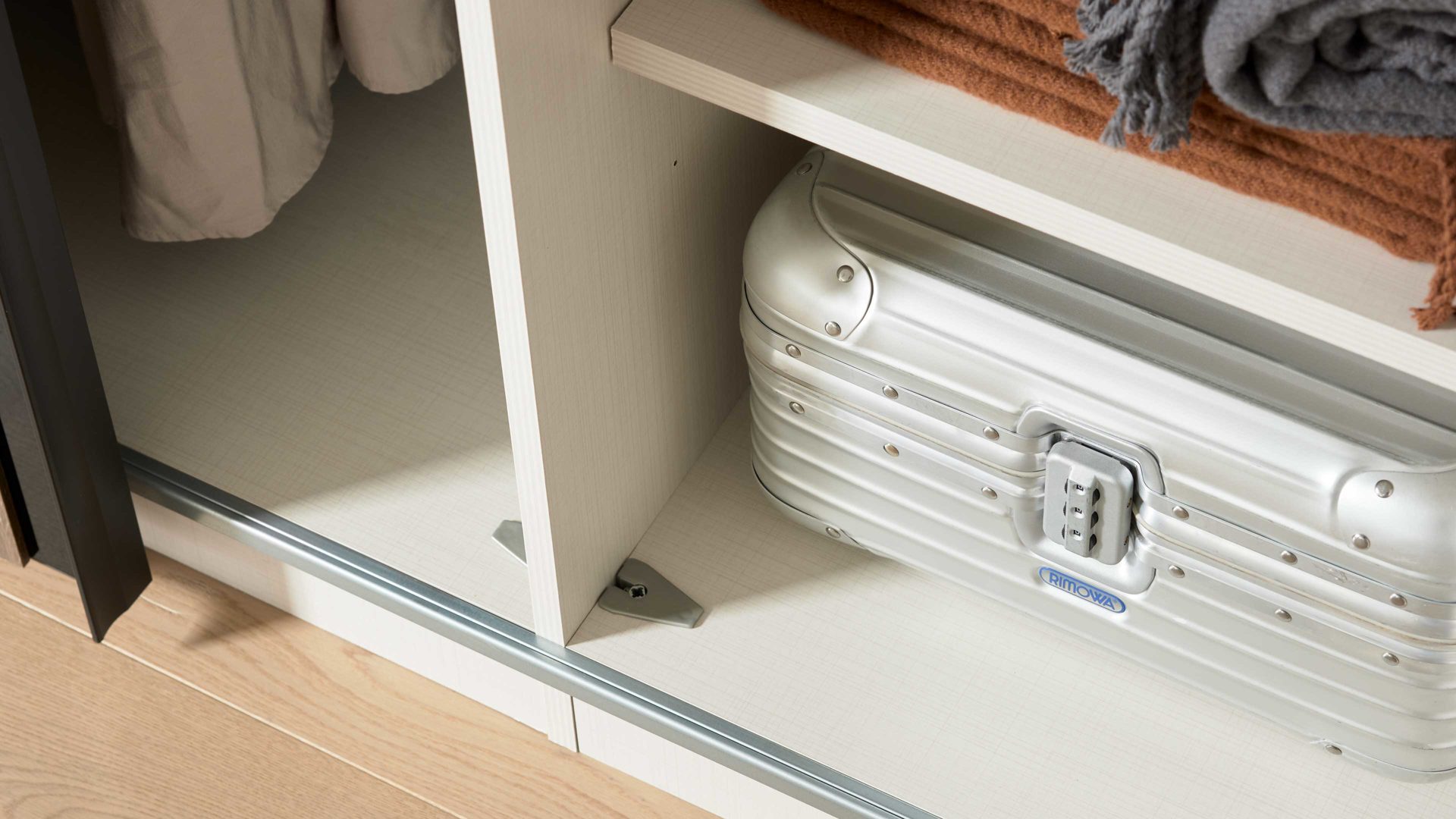 Die beiden Schwebetüren lassen sich dank ihres innovativen Führungssystems besonders leicht und leise bewegen – das sorgt jeden Tag für ein angenehm ruhiges Bediengefühl. Innen überzeugt der Schrank mit einer durchdachten Aufteilung: Mittig findest du zwei Kleiderböden und eine Kleiderstange, rechts und links außen jeweils sechs Fächer mit höhenverstellbaren Einlegeböden. So kannst du Kleidung, Accessoires und Bettwäsche ordentlich verstauen. Mit seinen Maßen von ca. 270 x 222 x 68 cm (B/LxHxT) passt der Schrank großzügig, aber harmonisch in dein Schlafzimmer.