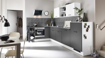 • Die Abbildung zeigt ein Wohnbeispiel, welches auch Dekoration sowie separat erhältliches Zubehör enthält. Im Lieferumfang enthalten sind eine Kücheninsel und eine Hochschranklösung.