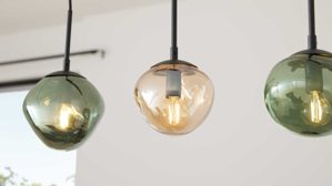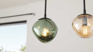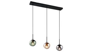 Mit der Hängelampe aus der Interliving Leuchten Serie 9350 bringst du ein echtes Design-Statement in deinen Wohnraum. DRei organisch geformte, matte Glas-Lampenschirme in den Farbtönen Amber, Grün und Rauch sorgen für ein lebendiges Lichtspiel, während der mattschwarze Metallsockel und die schwarzen Textilkabel der Pendelleuchte einen modernen Look verleihen.