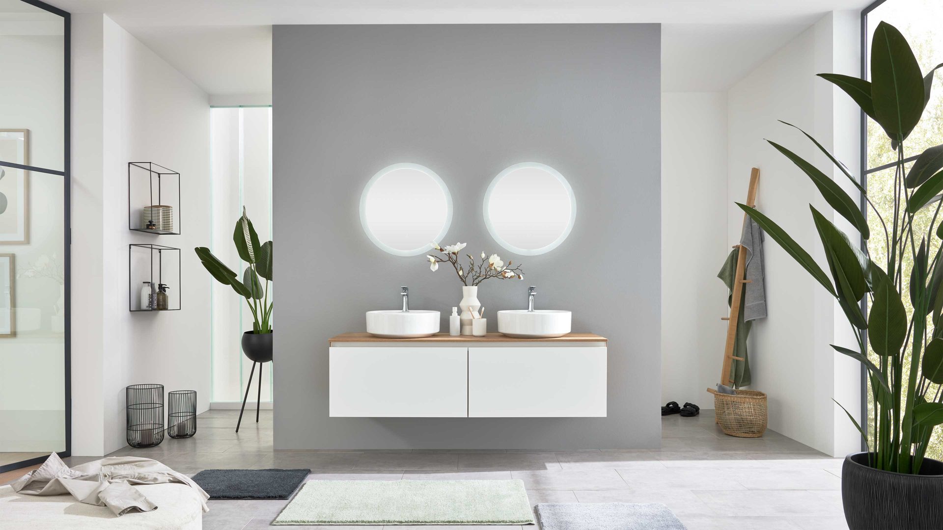 Zwei runde LED-Spiegel (Typ 15201, Ø ca. 60 cm, Tiefe ca. 2,5 cm) ergänzen das Ensemble. Sie verfügen über ein umlaufendes sandgestrahltes LED-Lichtfenster (ca. 4 cm breit), fest verbaute LED-Leuchtmittel mit 12 Watt, 5700 Kelvin, Touchsensor und LED-Konverter. Energieeffizienzklasse F (Spektrum A–G), Schutzklasse IP44. Für die Inbetriebnahme wird ein Starter-Set benötigt.
