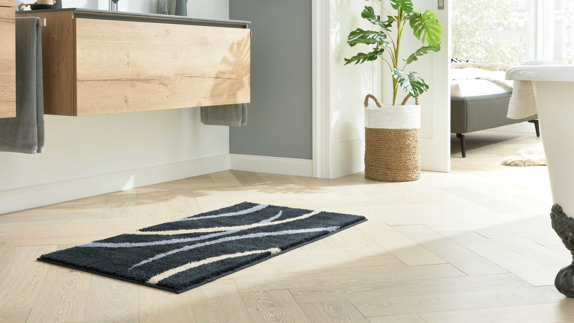 Hergestellt aus anthrazitfarbener Kunstfaser mit grafischem Muster, strahlt der ca. 65 x 115 cm (BxL) große Duschvorleger moderne Eleganz mit einer herrlich frischen Note aus, die perfekt zum Badezimmer passt.