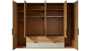 Der sechstürige Kleiderschrank bietet dir viel Platz für Kleidung und Accessoires. Mit Maßen von ca. 300 x 216 x 58 cm (B/LxHxT) überzeugt er durch eine clevere Innenaufteilung mit drei Kleiderstangen und sechs Kleiderböden. Zwei geräumige Schubladen – eine davon mit hochwertiger Kernholzfurnier-Front – ergänzen den Stauraum sinnvoll und sorgen für zusätzliche Ordnung.