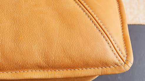 sonnengelber Lederbezug mit einer beigen Kontrastnaht und mattschwarzen Metallkufen