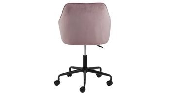 Dabei harmoniert der Drehstuhl in seiner sanften Formensprache mit zahlreichen Einrichtungsstilen: Dafür sorgt der pastellrosa Samtbezug, der die gesamte Sitzschale inklusive der bequemen Armlehnen weich umhüllt. Das pulverbeschichtete Metall-Drehkreuz fließt in mattem Schwarz stimmig in das Gesamtbild ein.