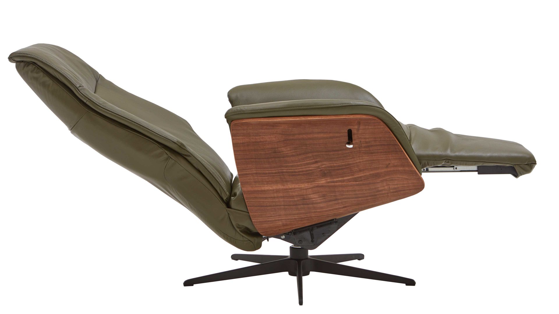 Sie sind auf der Suche nach einem schönen und sehr bequemen Sessel? Dann ist dieser Relaxsessel bzw. Drehsessel mit einem strapazierfähigen dunkelgrünem Lederbezug, der Sitzschale in geöltem Nussbaum und einem modernen Sternfuß aus schwarzem Metall genau das richtige Sitzmöbel für Sie. Nutzen Sie die manuell verstellbare Relaxfunktion und stellen Sie den Ledersessel so ein, dass Sie komfortabel lesen und fernsehen können.