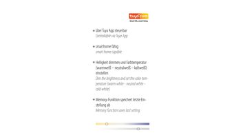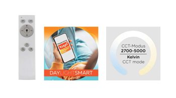 | Verstellbarkeit und Funktion: | dimmbar Fernbedienung CCT | Lichtmanagement Memoryfunktion per App steuerbar Timer | |