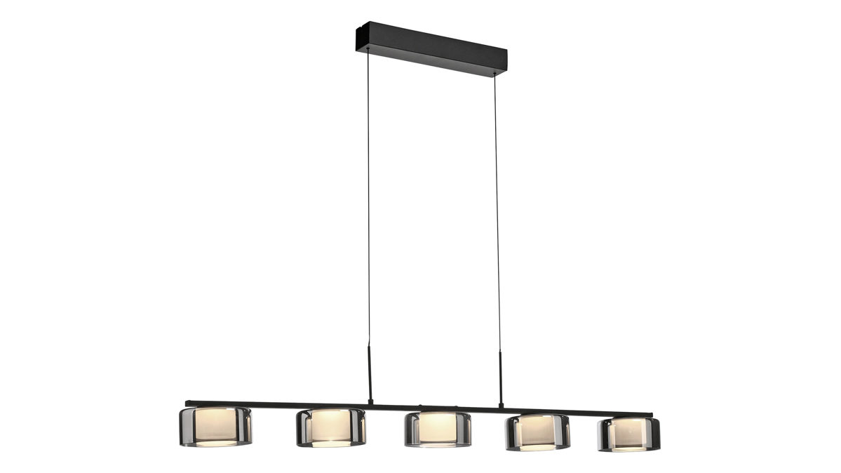 matt schwarzes Metall kombiniert mit fünf runden Lampenschirmen aus Rauchglas