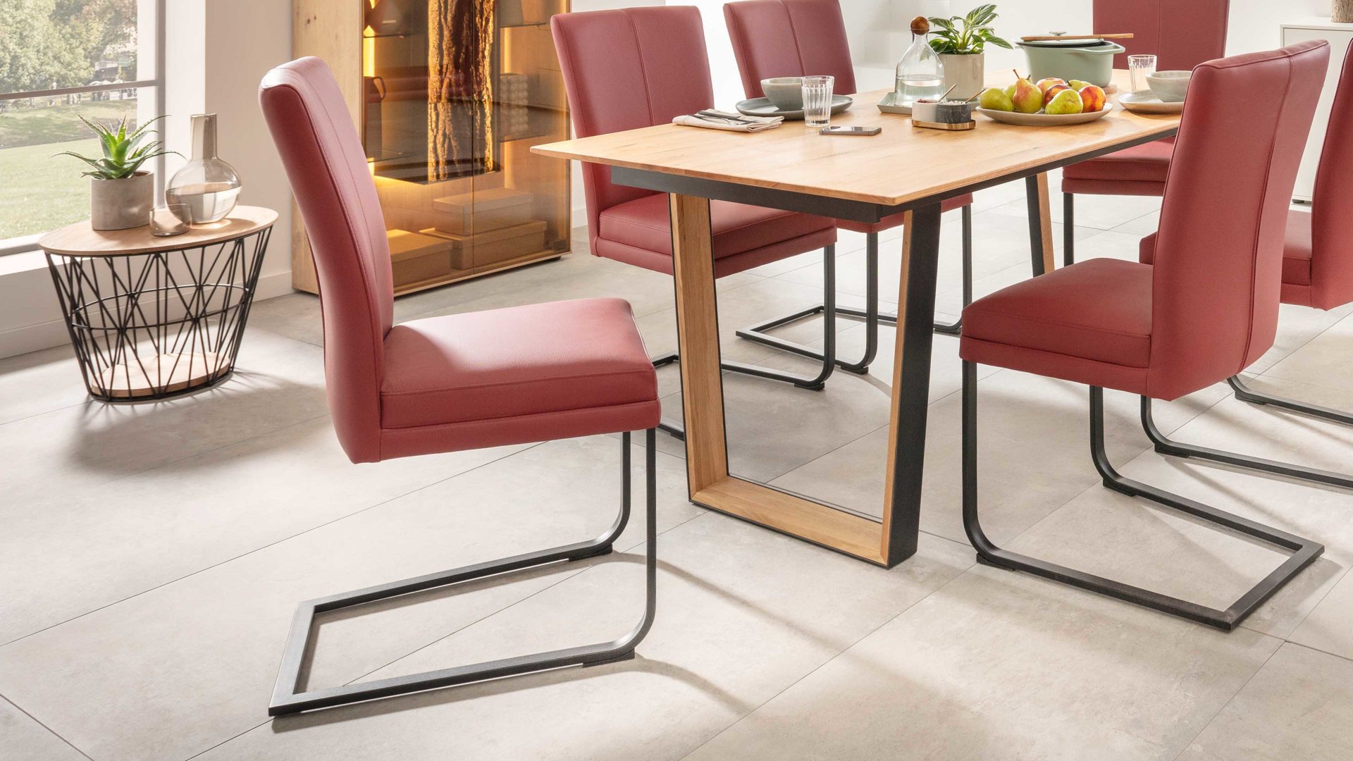 Der bequeme Esszimmerstuhl überrascht neben einem hohen Sitzkomfort mit einer ansprechenden Optik. Denn der Freischwinger besticht insbesondere durch den rubinroten Lederbezug und dem Edelstahlfuß aus Flachstahl, der sich mit einer gebürsteten Oberfläche präsentiert. Dank dieser Materialauswahl wirkt das Sitzmöbel ohne Armlehnen besonders modern.