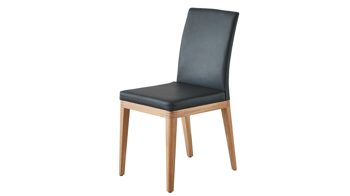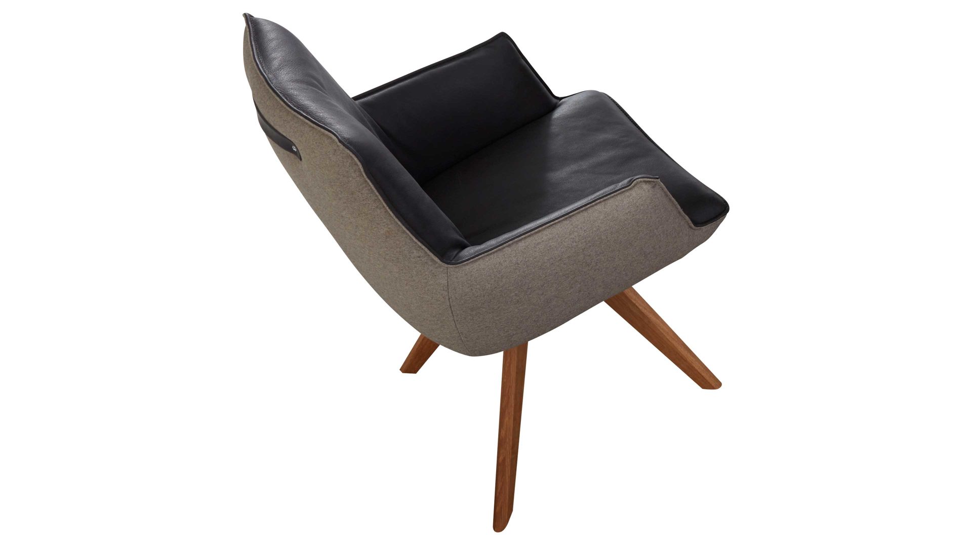 Als Basis fungieren UV-beschichtete Wildeichenfüße mit Öl-Effekt, die für eine natürlich-warme Note sorgen, und ein mattschwarz pulverbeschichtetes Untergestell. Die Sitzeinheit des außergewöhnlichen Stuhls ist innen mit dunklem Leder bezogen - außen weist sie einen Lodenbezug auf.