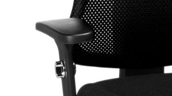 Über die Rastermechanik lässt sich die ergonomisch taillierte Rückenlehne mit integrierter Lendenwirbelstütze in der Höhe verstellen. Auch die Armlehnen sind höhenverstellbar.