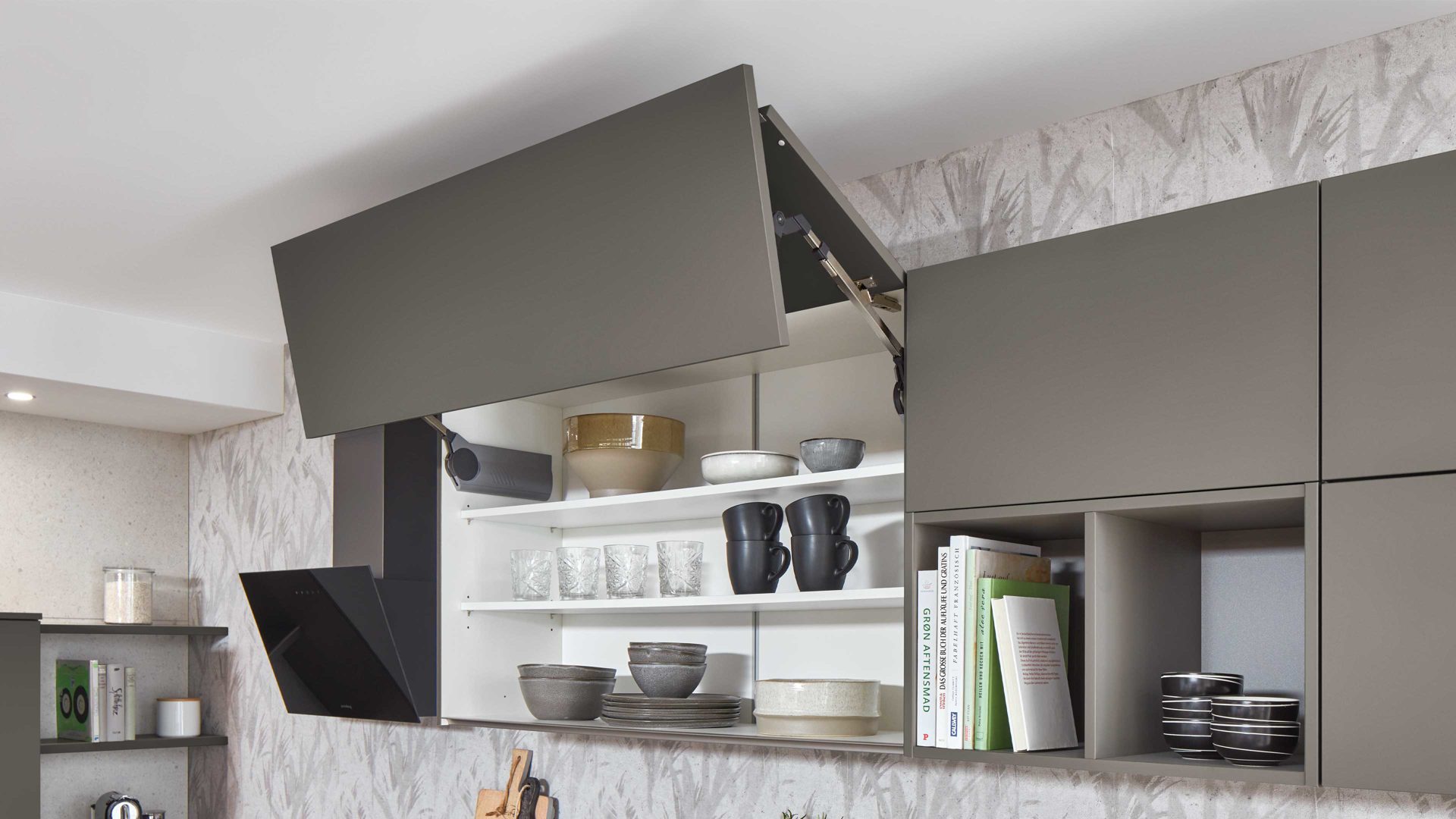 Auf der linken Seite sorgen halbhohe Hochschränke und offene Nischenregale für eine lockere Optik und gleichzeitig praktische Aufbewahrungsmöglichkeiten. Rechts befindet sich der zentrale Arbeitsbereich mit Kochfeld, hochwertiger Edelstahl-Einbauspüle und Hängeschränken mit Falttüren. Die kopffreie Abzughaube schafft zusätzliche Bewegungsfreiheit und unterstreicht das moderne Gesamtbild.