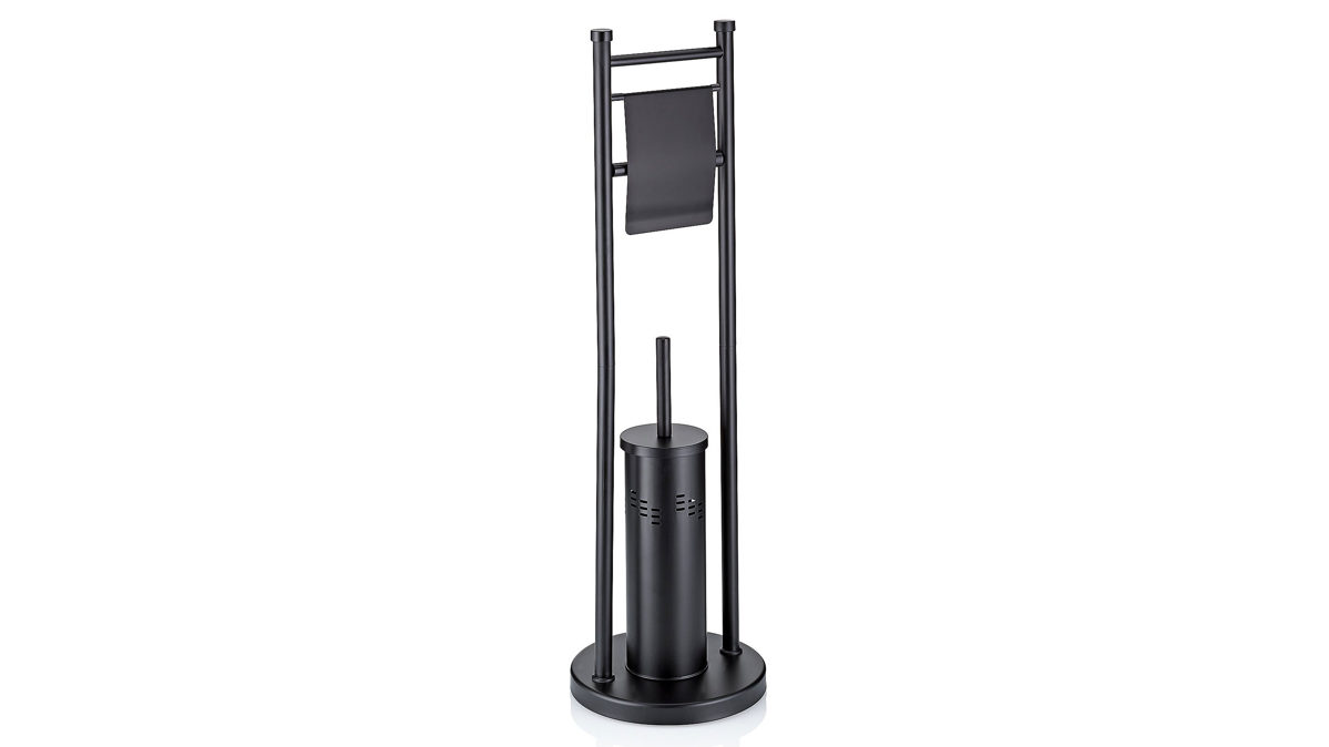 Toilettengarnitur Swing aus gebürstetem schwarzem Edelstahl mit umlaufendem Lochmuster am WC-Toilettenbehälter, schwarzer Kunststoffgriff. Bürstenkopf der WC Garnitur auswechselbar, herausnehmbare Innenbehälter aus Kunststoff. An der Standgarnitur kann eine Rolle WC-Papier eingehängt werden. Maße ca. 22 x 78 cm (DxH)