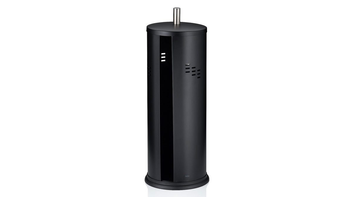 Für den Toilettenpapier-Nachschub: der Toilettenpapierbehälter SWING aus pulverbeschichtetem Metall in der Farbe matt schwarz, für bis zu drei WC-Papierrollen. Die seitliche Öffnung ermöglicht das einfache Entnehmen und Befüllen des Toilettenpapiers. Der Toilettenpapierbehälter hat einen Durchmesser von ca 15 cm und ist ca. 40 cm hoch.