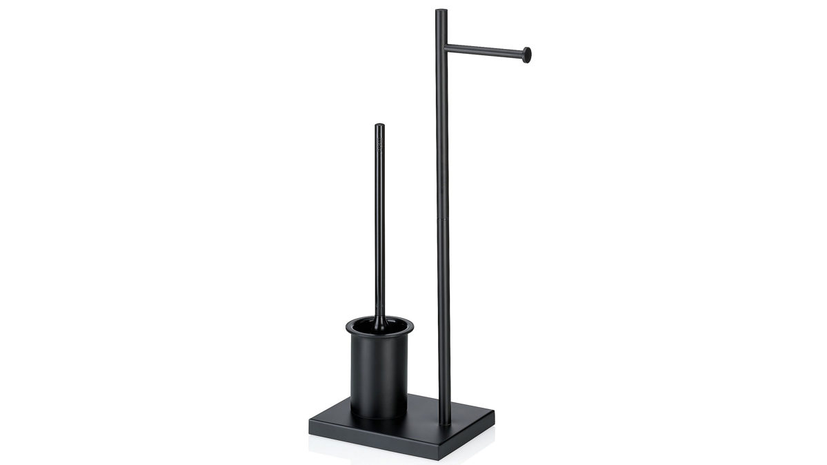 Verleihen Sie Ihrem Badezimmer einen Hauch von Eleganz mit der Devin Toilettengarnitur. Diese hochwertige, matt-schwarze Garnitur aus pulverbeschichtetem Metall bietet nicht nur einen integrierten Toilettenpapierhalter, sondern auch eine WC-Bürste mit schwarzem Kunststoffgriff und schwarzen Borsten, die in einem eleganten schwarzen Becher aufbewahrt wird. Das Modell Devin vereint zeitloses Design und praktische Funktionalität für Ihr modernes Badezimmer. Maße ca. 18 x 68 x 23 cm (BxHxT)